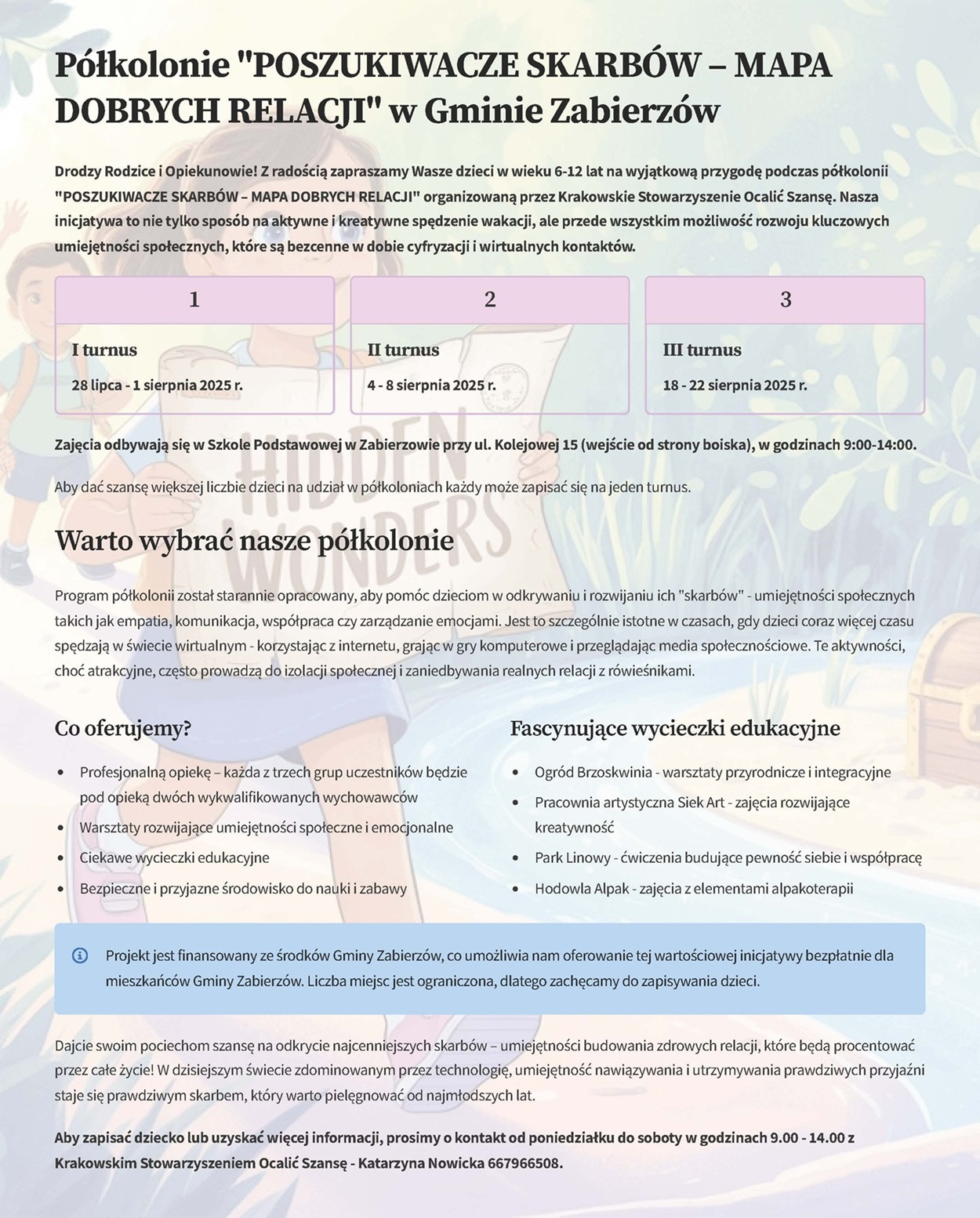 Twoje dziecko w wieku 6-12 lat szuka niezapomnianej przygody? Krakowskie Stowarzyszenie Ocalić Szansę zaprasza na wyjątkowe półkolonie, które łączą aktywną zabawę z rozwojem kluczowych umiejętności społecznych!