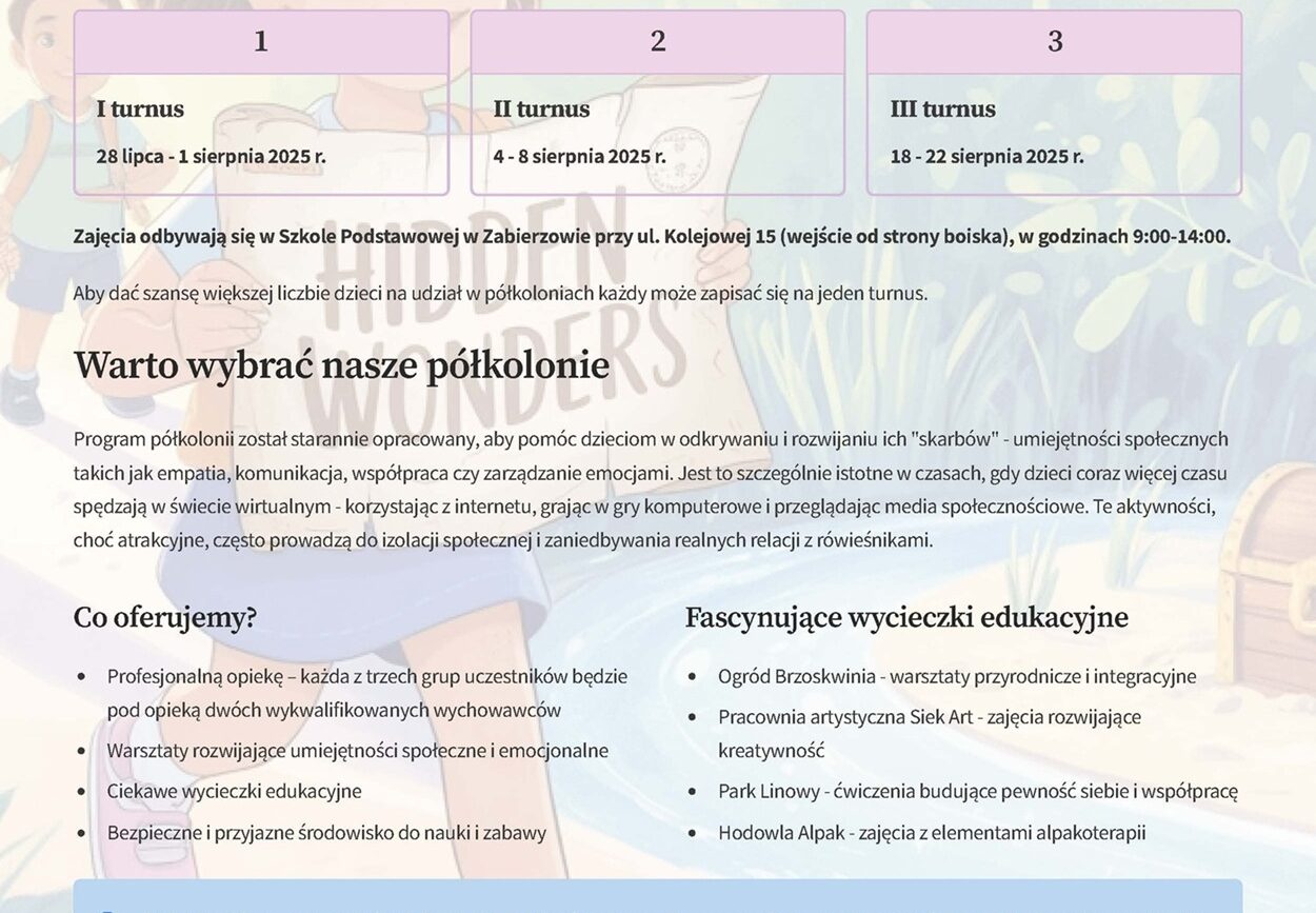Limit 60 miejsc na półkolonie został wyczerpany. Zapisy zostały zamknięte.